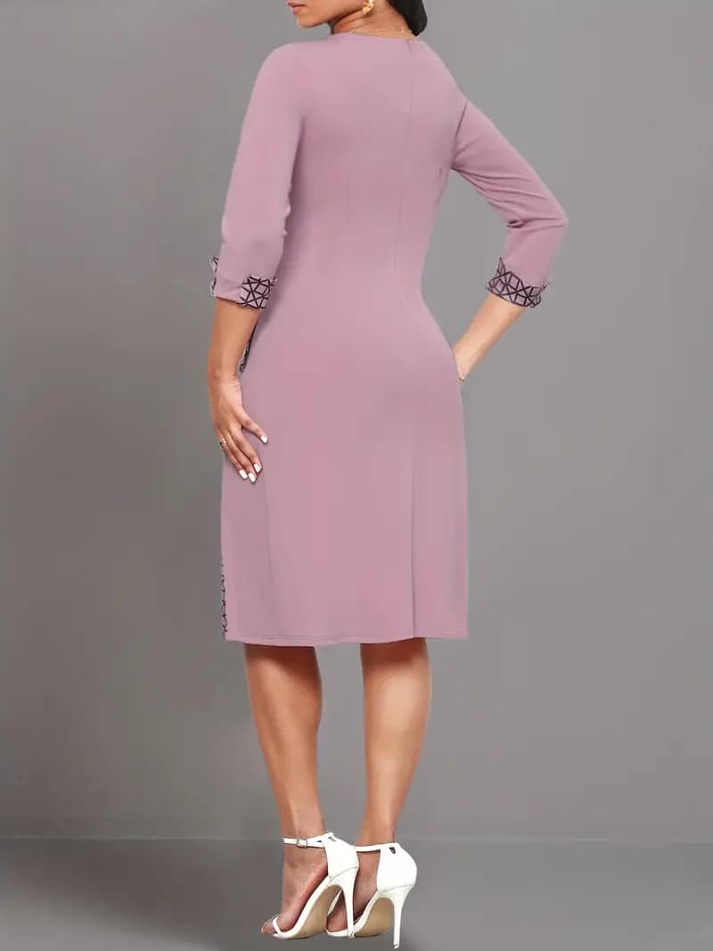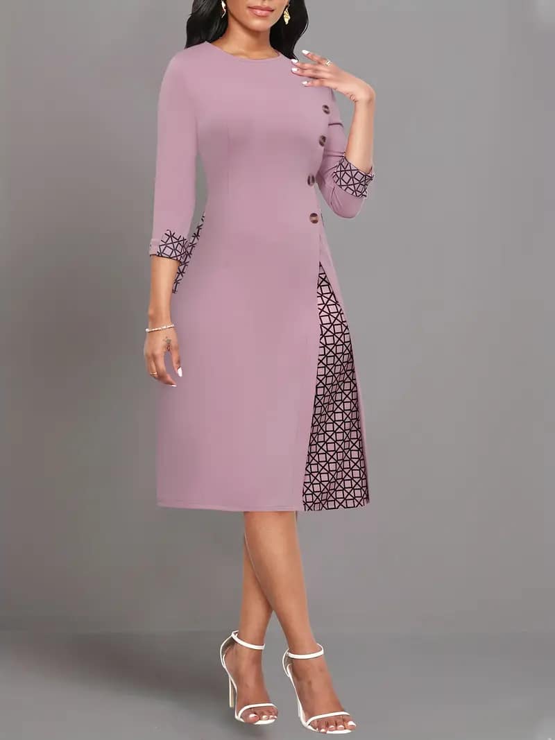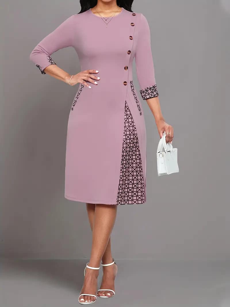 Elegant Fit and Flare Crew Neck Dress – Polyester Geometric Patterned Mid Elasticity Knit Fabric with Button Decor – Perfect for Adult Womens Elegant Dressing All Seasons