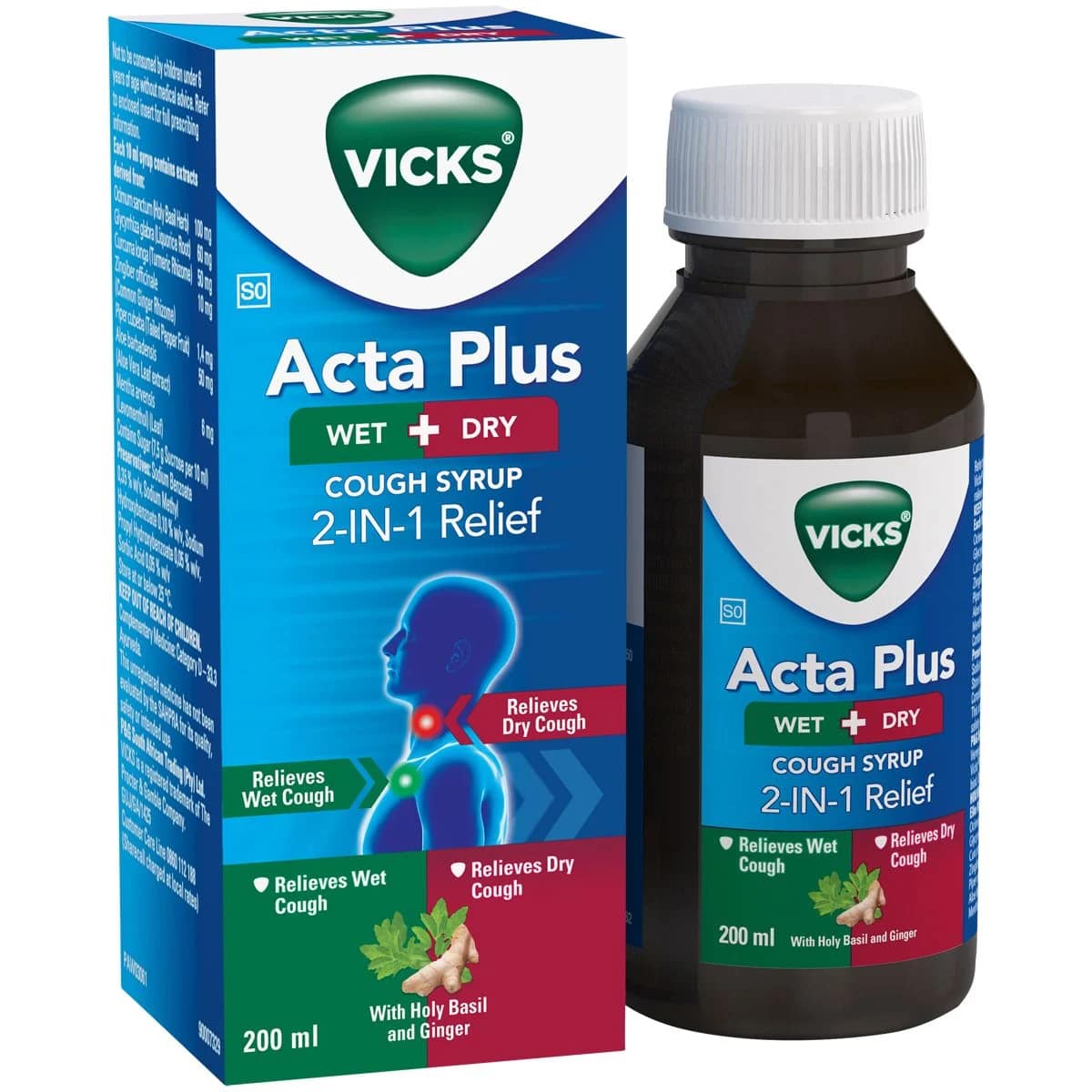 Vicks Acta Plus Wet & Dry Cough Syrup with holy basil and ginger, relieves both dry and wet coughs. Gift yourself with uninterrupted night sleep and the energy to face a new day, at home, at work, and at leisure. Persistent dry or wet cough can wear you down in body and spirit and worse, it can lock you in at home while depriving you of the much needed bed rest. Use Vicks ActaPlus Cough Syrup which provides 2 in 1 relief from dry cough & wet cough associated with colds and influenza.